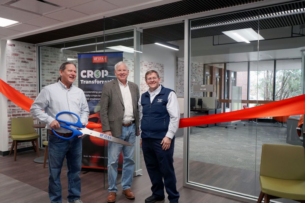 Carlos Messina, Ph.D. (left), J. Scott Angle, Ph.D. (middle), and Christopher Gunter, Ph.D. (right) attend a ribbon cutting for an AI Lab. | Image Courtesy of UF/IFAS